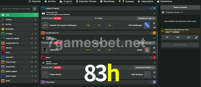 O 83h oferece uma grande seleção de opções de apostas em e-sports com probabilidades competitivas